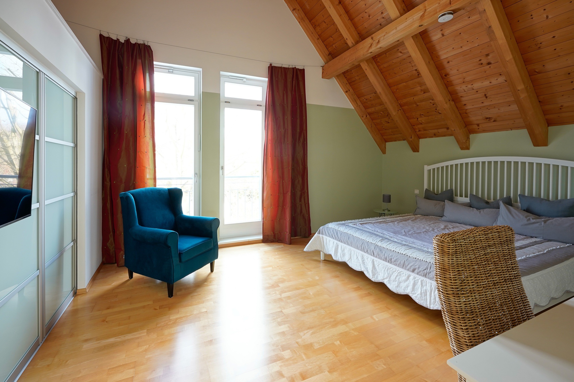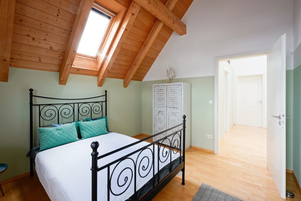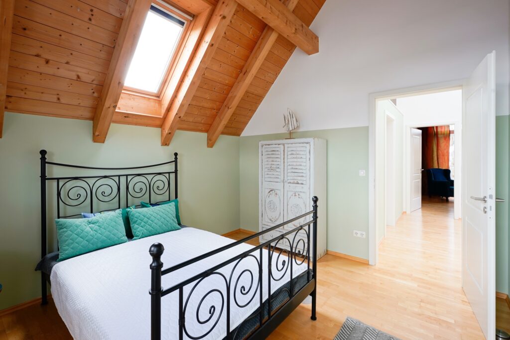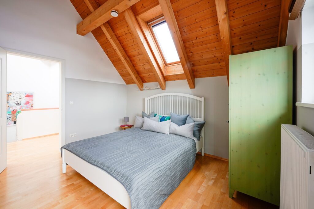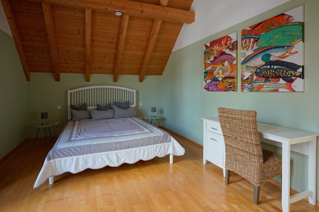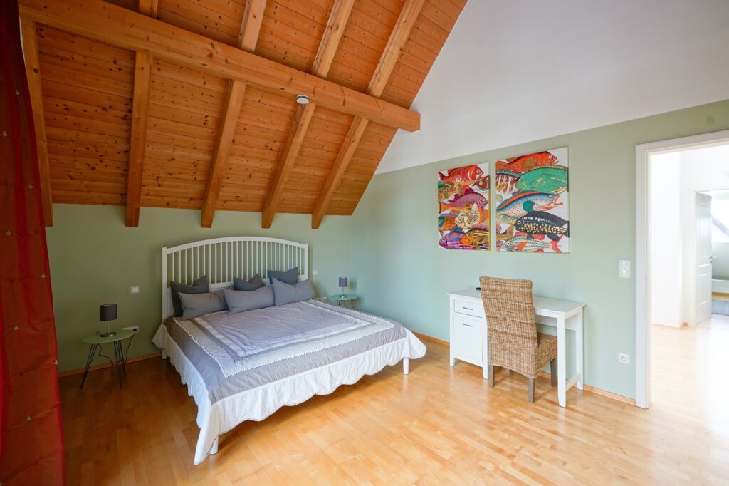 Das Hauptschlafzimmer mit begehbarem Kleiderschrank und SAT-TV bietet ein Bett mit 1.80 Meter Breite, die beiden anderen Schlafzimmer haben Bettenbreiten von 1.60 Meter und 1.40 Meter. Ebenso befindet sich im OG das neu renovierte Bad.